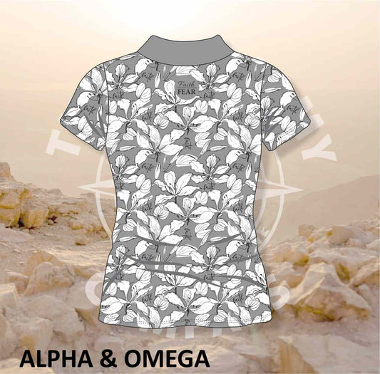 Alpha and Omega Faith Over Fear Grey Floral Ladies Golf Shirt